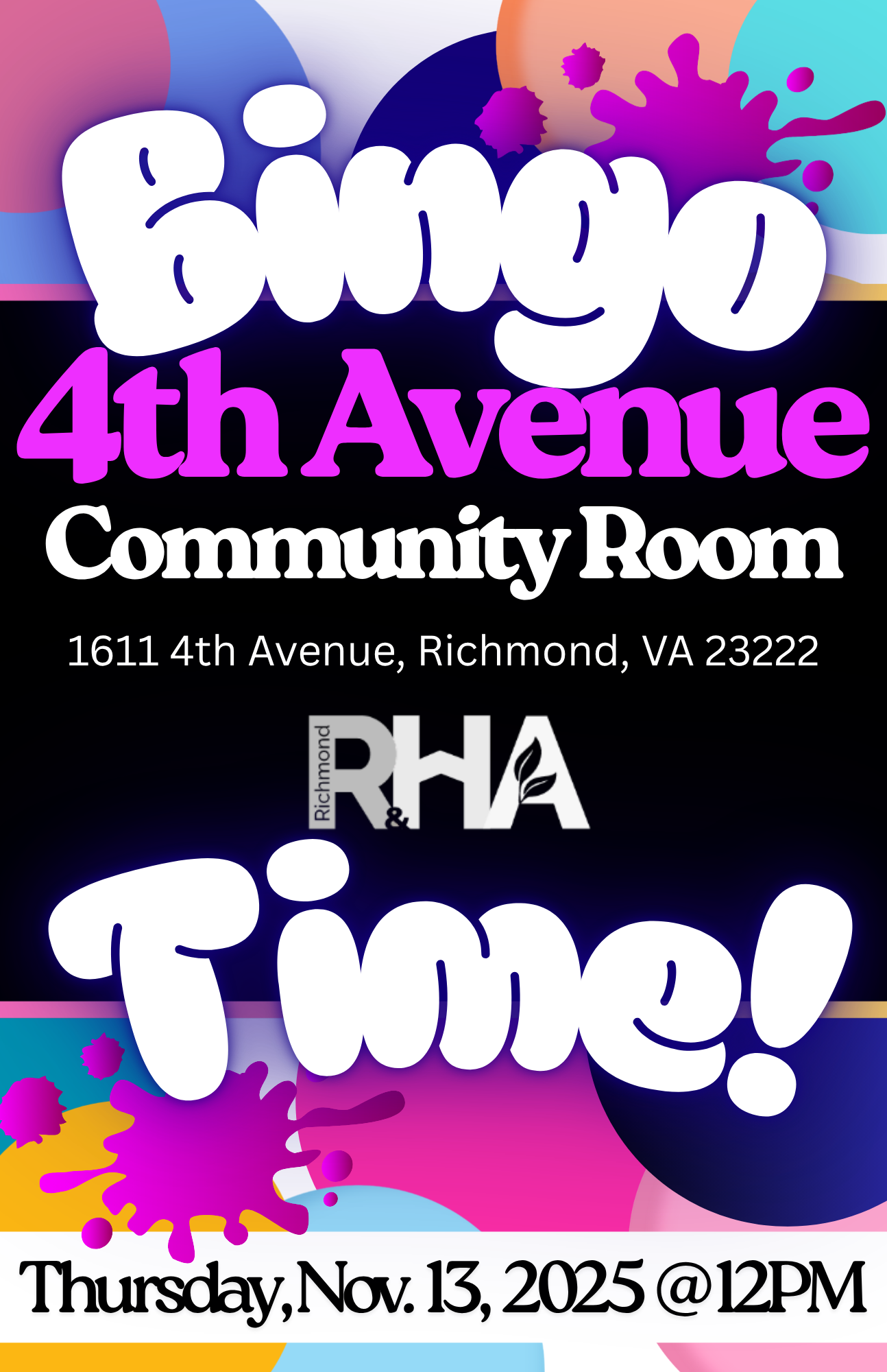 Home Calendar - Richmond Redevelopment & Housing Authority Community Event Bingo Bingo + Add to Google Calendar + iCal / Outlook export Date Thursday, Nov 13, 2025 Location 4th Avenue 1611 4th Ave Category Community Event Share this event