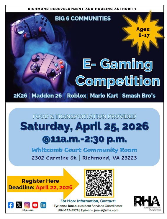 Home Calendar - Richmond Redevelopment & Housing Authority E-Gaming Competition E-Gaming Competition + Add to Google Calendar + iCal / Outlook export Date Saturday, Apr 25, 2026 Time 11:00 AM - 2:30 PM More Info Register Location Location Whitcomb Court 2302 Carmine St. Register
