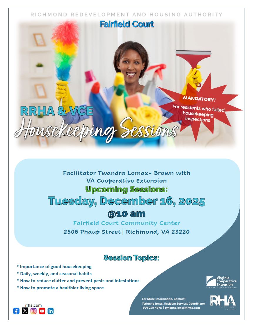 Home Calendar - Richmond Redevelopment & Housing Authority Housekeeping Session – Fairfield Court Housekeeping Session – Fairfield Court + Add to Google Calendar + iCal / Outlook export Date Tuesday, Dec 16, 2025 Location Fairfield Court Community Center 2506 Phaup Street, Richmond, VA Share this event