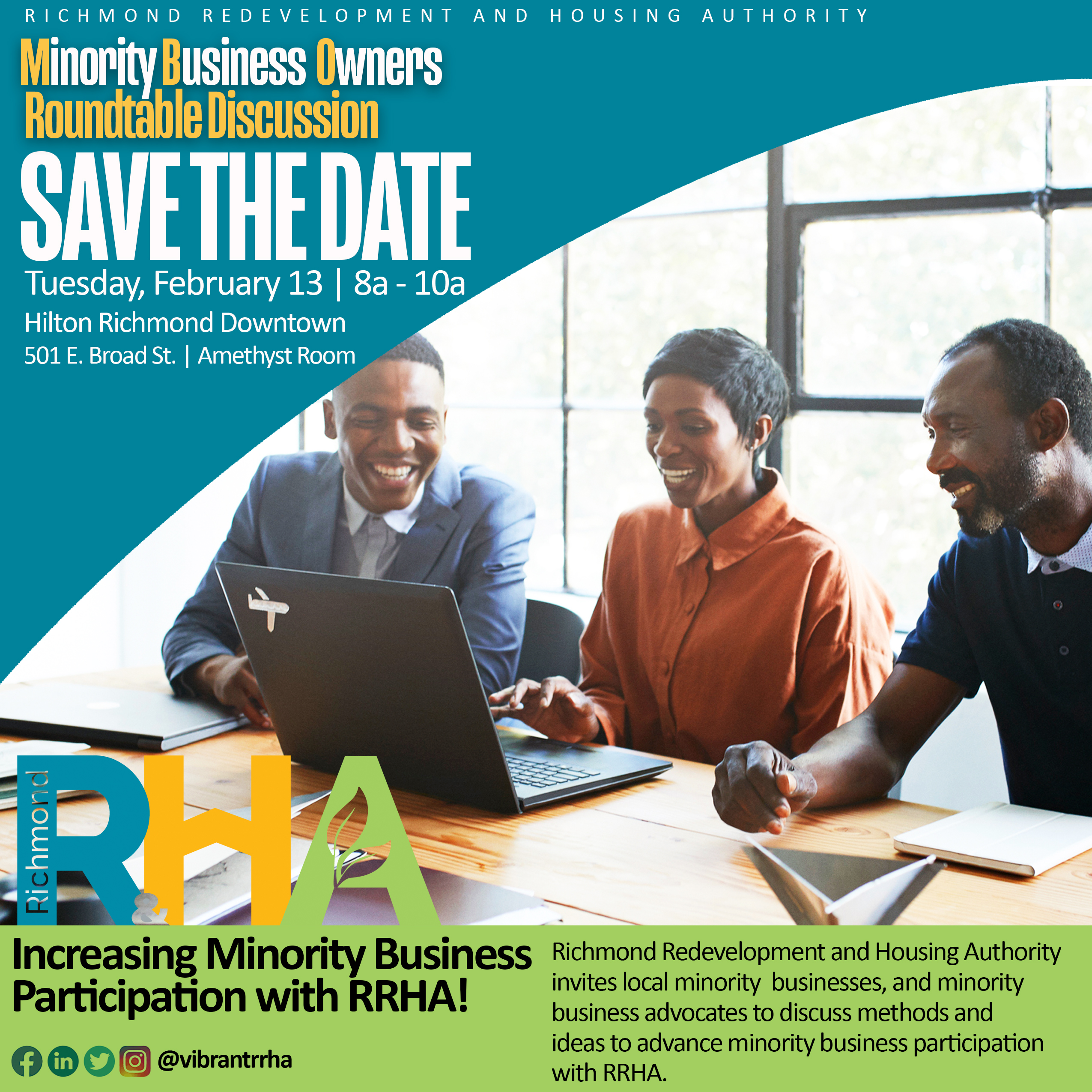 Home Calendar - Richmond Redevelopment & Housing Authority Minority Business Owners Roundtable Discussion Minority Business Owners Roundtable Discussion Date Tuesday, Feb 13, 2024 Past Time 8:00 AM - 10:00 AM Location Hilton Richmond Downtown 501 E. Broad St. Richmond, VA 23219 Organizer RRHA Phone 804-780-4200 Email info@rrha.com Share this event