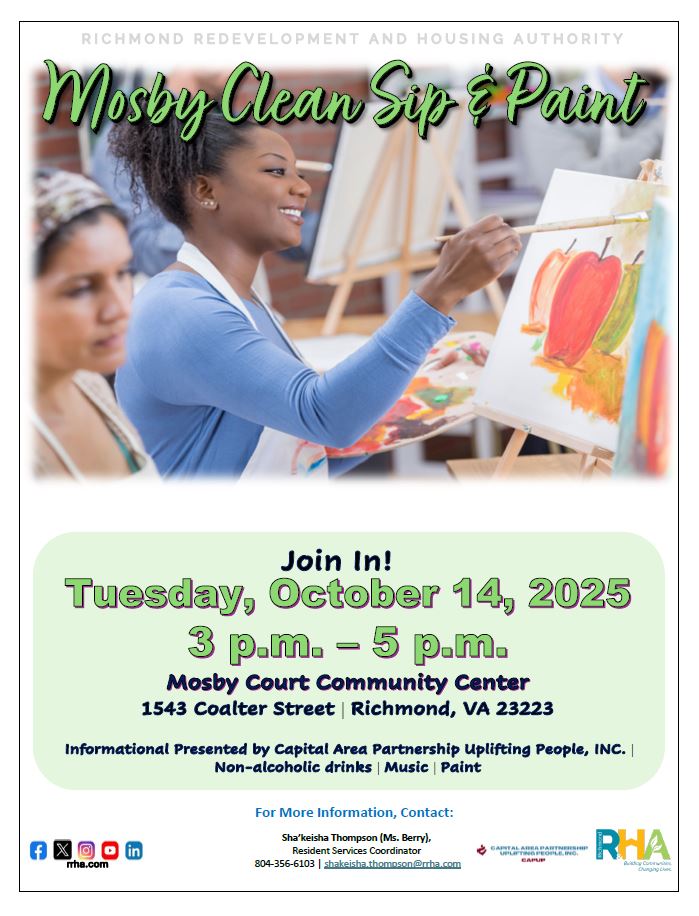 Home Calendar - Richmond Redevelopment & Housing Authority Community Event Mosby Clean Sip & Paint Mosby Clean Sip & Paint + Add to Google Calendar + iCal / Outlook export Date Tuesday, Oct 14, 2025 Time 3:00 PM - 5:00 PM Location Mosby Court 1543 Coalter Street Category Community Event Share this event