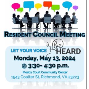 Home Calendar - Richmond Redevelopment & Housing Authority Resident Council Meeting Mosby Tenant Council Meeting Mosby Tenant Council Meeting Tags: Mosby Court Date Monday, Sep 09, 2024 Past Time 4:00 PM - 5:00 PM Location Mosby Court 1543 Coalter Street Category Resident Council Meeting Share this event