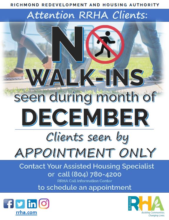 Home Calendar - Richmond Redevelopment & Housing Authority RRHA CLOSED NO WALK-INS NO WALK-INS Date Thursday, Dec 28, 2023 Past Time 8:00 AM - 6:00 PM Location RRHA Administrative Offices, 4th Floor 600 E Broad Street, Richmond, VA 23219 Category RRHA CLOSED Share this event