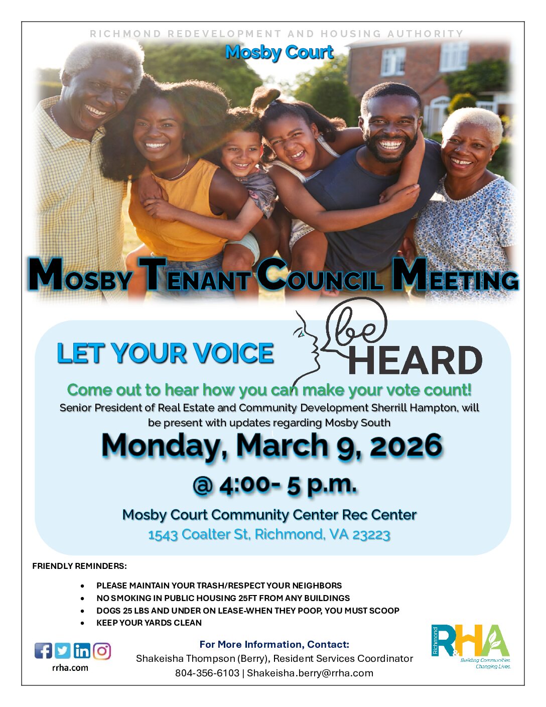 Home Calendar - Richmond Redevelopment & Housing Authority Resident Council Meeting Resident Council Meeting + Add to Google Calendar + iCal / Outlook export Date Monday, Mar 09, 2026 Time 4:00 PM - 5:00 PM Location Mosby Court 1543 Coalter Street Share this event
