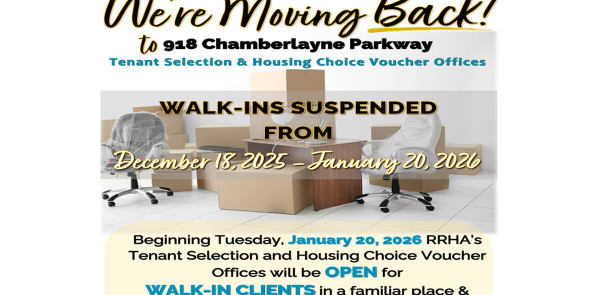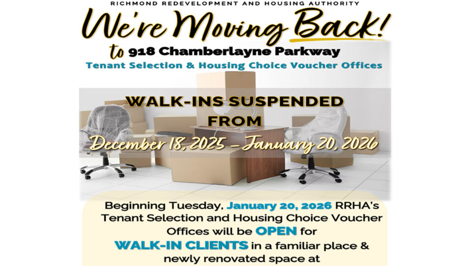 Thursday, December 18, 2025 is the last day that walk-in clients will be seen at RRHA’s 600 East Broad Street location. On January 20, 2026, RRHA staff will welcome walk-in clients at 918 Chamberlayne Parkway. RRHA will share additional details regarding community information sessions in the coming weeks.